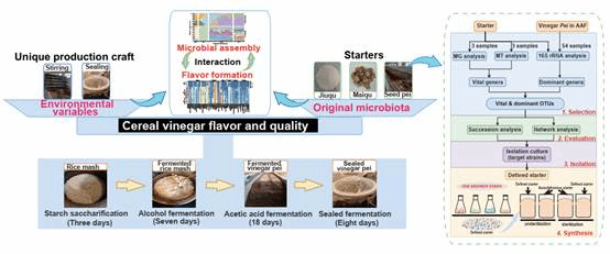 中国传统固态食醋采用未经灭菌的原料,在开放式多菌种混合体系中进行酿造。其工艺过程大体包括淀粉质原料的糖化(SS)和酒精发酵(AF)、酒醪的固态醋酸发酵(AAF)和厌氧封醅陈酿(SF)等主要步骤。在多种微生物共同的作用下,完成了以酒精、淀粉等原料为主要底物合成包括醋酸在内的多种有机酸、挥发性风味物质等,最终形成了味道浓郁且独特的中国传统食醋。近年来,人工构建合成菌群且用于传统工艺革新受到广泛关注,合成菌群可用于快速启动发酵并保证产品风味的稳定性。但已有的研究未能系统阐明传统酿醋微生物群落的演替及其驱动力,及其交互作用与功能。上述信息的缺失客观上阻碍了人工构建菌群理性设计与应用。