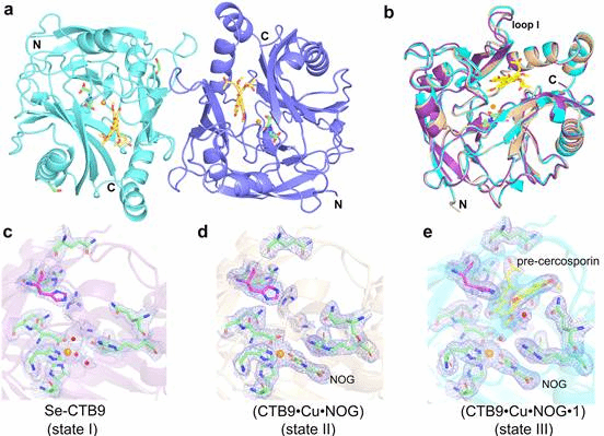 图2.CTB9、CTB9•Cu•NOG、CTB9•Cu•NOG•pre-cercosporin的晶体结构