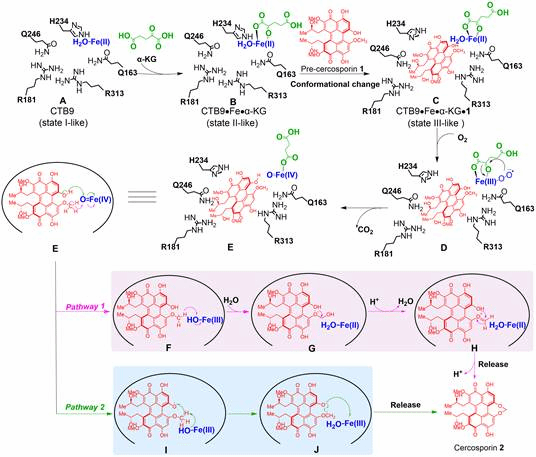 基于前期的研究基础(Zhou, et al, 2021,Microb Cell Fact),首先,通过基因敲除和体外重构验证了催化尾孢菌素中七元亚甲基二氧桥环形成的关键酶是α-酮戊二酸(α-KG)依赖的双加氧酶CTB9(图1)。其次,为了揭示CTB9的催化机理,解析了CTB9在催化过程中三种不同状态的蛋白质晶体Se-CTB9 (2.29 Å, 7EUS)、CTB9•Cu•NOG (2.49 Å, 7EUT)和CTB9•Cu•NOG•pre-cercosporin (2.20 Å, 7EUU) (图2),获得了CTB9与底物pre-cercosporin的结合方式,经过定点突变验证了关键氨基酸残基在CTB9催化过程中起着关键作用。为了进一步揭示CTB9在催化合成尾孢菌素中七元亚甲基二氧桥环的机理,结合量子化学计算,发现底物pre-cercosporin在经过Fe离子的变价形成[pre-cercosporin/O=Fe(IV)]过渡态后,可能有经历两种途径转化为产物cercosporin。然而途径2的活化能垒明显低于途径1,为此,本研究清晰地阐明了尾孢菌素生物合成途径中七元亚甲基二氧桥环的形成机制,为解析更多含有亚甲基二氧桥环的天然产物的合成途径提供了重要的分子和理论基础。