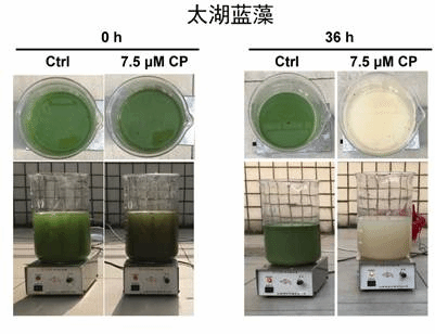 蓝藻作为最古老的光合自养型生物之一,能够利用太阳光将二氧化碳(CO2)转化为生物量,但是蓝藻也能扮演“魔鬼”的角色。在营养丰富的水体中,蓝藻在夏季能够大量繁殖,在水面形成一层蓝绿色而有腥臭味的浮沫,称为“水华”。大规模的蓝藻爆发,被称为“绿潮”,可引起水质恶化、水中氧气被耗尽、鱼类死亡等危害,从而破坏水体生态系统。如我国太湖、巢湖和滇池等淡水湖深受蓝藻水华的折磨,严重时造成了当地居民用水严重短缺,影响了当地居民的正常生活,但是该问题始终未得到彻底的解决,因此开发一种有效治理蓝藻危害的方法一直是研究热点。