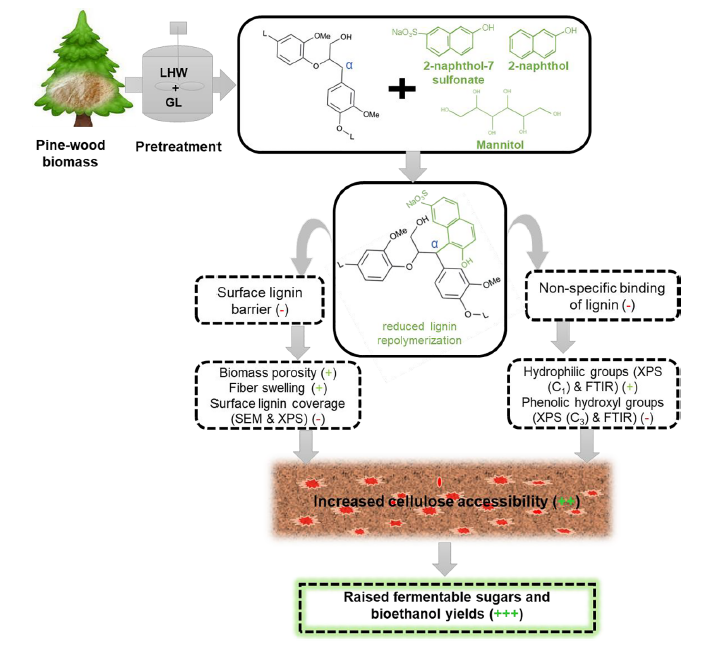 近年来,我校世界杯官网孙付保教授团队在纤维质糖精炼型生物制造方面取得明显进展,相关成果陆续发表在Green Chem (2021, 23: 9600-9609)、Bioresouce Technology (2022, 344: 126264)、Bioresource Technology (2021, 338: 125505)、Industrial Crops & Products (2021, 171: 113975)。近期,研究团队在强化木质纤维素底物水解糖化方面取得重要进展,研究成果“Alleviating lignin repolymerization by carbocation scavenger for effective production of fermentable sugars from combined liquid hot water and green-liquor pretreated softwood biomass”正式发表于Energy Conversion and Management (IF=9.709) (https://doi.org/10.1016/j.enconman.2021.114956)
