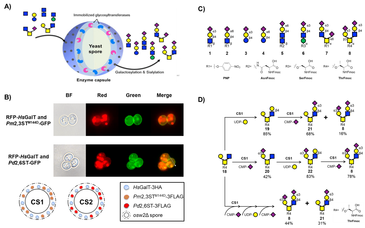 高晓冬教授团队采用酿酒酵母孢子固定化酶策略,将两种唾液酸转移酶(ST)分别同一种半乳糖基转移酶(GalT)共同封装于酿酒酵母孢子表面,成功制备了两种含有GalT和ST的酿酒酵母孢子胶囊。利用这两种孢子胶囊,通过串联反应大量制备了包括人乳寡糖(3’SL和6’SL)、N-聚糖生物标记物(ALG1-CDG生物标记物)、Core M1 O-Man聚糖、Core 3 O-GalNAc聚糖在内的一系列含有末端Sia-Gal结构的天然低聚糖,同时成功实现了包含有近期在SARS-CoV-2病毒S蛋白受体结合域中鉴定出的两种带有单唾液酸或双唾液酸结构的Core 2 O-GalNAc聚糖文库的系统制备。孢子酶固定化技术操作简单,环境友好,可以进一步推广到用于合成复杂寡糖的其它糖基转移酶的固定化研究。
