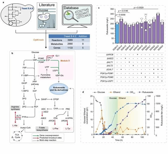 为此,本研究在酿酒酵母中重构甜茶苷代谢合成途径。首先,基于合成生物学中的代谢网络模块化方法将甜茶苷合成途径分为5个模块,包括萜类合成模块、P450s模块、甜茶苷合成模块、UDP-葡萄糖合成模块和甜茶苷转运模块。通过优化萜类合成模块,并引入P450s模块和甜茶苷合成模块,成功获得甜茶苷产量为4.5 mg/L的生产底盘(图1)。其次,通过改造P450酶、构建人工底物代谢通道、扩大内质网等策略解除P450s模块中的限速步骤,甜茶苷产量提高至67.7 mg/L(图2)。随后,结合蛋白质结构预测、分子对接等技术开发了一种针对甜茶苷转运模块外排泵筛选的快捷方法。通过外排泵抑制实验判定甜茶苷外排泵属于ABC外排泵家族;经实验验证PDR11为酿酒酵母中甜茶苷的外排泵;强化甜茶苷转运模块后,产量提高至155.6 mg/L;同时,本研究通过强化MSN4表达提高工程菌株对甜茶苷的适应性后,甜茶苷的产量达到205.5 mg/L(图3)。最后,针对甜茶苷合成途径构建了基因组规模代谢网络模型,并应用OptKnock算法预测甜茶苷生产底盘中的基因敲除靶点,发现UDP-葡萄糖供给不足是限制甜茶苷高效合成的一个关键因素,通过UDP-葡萄糖合成模块进行优化与代谢流再分配后,甜茶苷在摇瓶中的产量达到302.1 mg/L,经15-L发酵罐放大培养后,甜茶苷产量达到1368.6 mg/L(图4)。