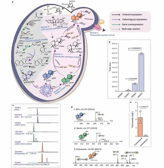 甜菊糖苷是从甜叶菊中提取的一类天然甜味剂,根据其侧链上葡萄糖基位置和个数的不同,可分为甜茶苷、甜菊苷、莱鲍迪苷A、莱鲍迪苷B、莱鲍迪苷C等60余种类型。目前市场上的甜菊糖苷主要来源于植物提取。但植物中甜菊糖苷的丰度低,植物生长具有季节依赖性,且提取过程复杂,这限制了甜菊糖苷的大规模生产。与传统的植物提取法相比,微生物发酵法能够克服以上缺点,有效地提高甜菊糖苷的合成效率。因此,通过构建微生物底盘细胞,以廉价碳源为底物从头合成甜菊糖苷具有重要意义。