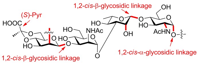 痢疾志贺氏菌10血清型O-抗原由四糖重复单元[→2)-β-D-Manp4,6(S)Pyr-(1→3)-α-D-ManpNAc-(1→3)-β-L-Rhap-(1→4)-α-D-GlcpNAc-(1→]组成(图1),其中D-甘露糖修饰有(S)-4,6-O-丙酮酸缩酮基。发展痢疾志贺氏菌10型O-抗原寡糖的化学合成方法、并将合成寡糖应用于生物医药研究,将为明确这一结构特异性糖链的免疫活性构效关系提供基础。该四糖结构中含有三个1,2-顺式-糖苷键,包括一个β-D-甘露糖苷键、一个β-L-鼠李糖苷键和一个α-D-氨基葡萄糖苷键,其化学合成具有很大挑战性。