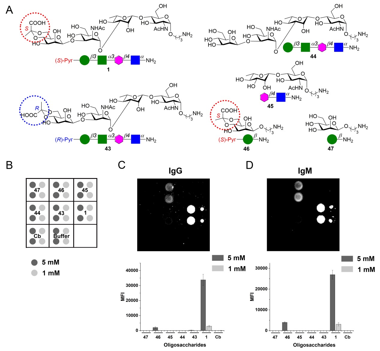 此外,进一步制备了(R)-4,6-O-丙酮酸缩酮基四糖,无丙酮酸缩酮基四糖等糖链片段(图3)。利用糖芯片技术,以痢疾志贺氏菌抗血清对合成寡糖的抗原性进行分析。发现该四糖单元为痢疾志贺氏菌10型O-抗原的有效抗原表位,且(S)-4,6-O-丙酮酸缩酮基是关键结构因子。本研究结果为痢疾志贺氏菌10型O-抗原的疫苗研发提供了理论基础。此外,本研究首次对糖链中S和R构型丙酮酸缩酮基的生物活性作直接比较,并发现有价值的信息,将为细菌糖链中丙酮酸缩酮基等稀有修饰基团的活性研究提供参考。