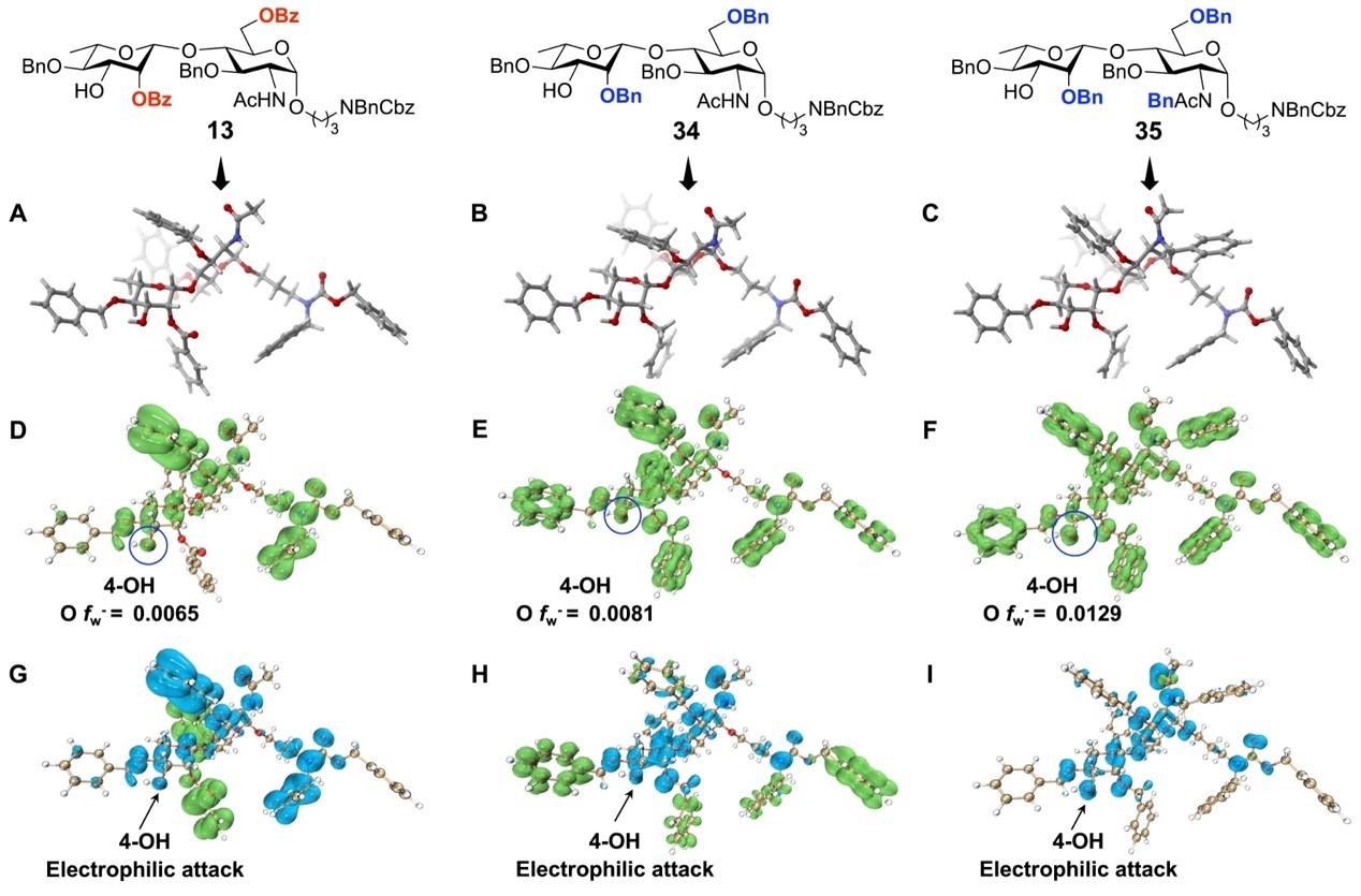 在糖基受体中增加供电子性保护基可以提高糖基受体反应活性已被熟知,但是其理论机制并未充分理清。尹健教授团队基于具有不同反应活性的3个二糖受体13,34和35,利用量子化学计算探究了糖基受体活性调控的理论机制(图2)。首先,计算得到了糖基受体的优势构象,发现不同活性的糖基受体优势构象无显著差异。鉴于糖基受体的羟基需亲核进攻糖基供体,通过轨道权重福井函数和双描述符对不同糖基受体羟基的亲核性进行定量分析,可直观的呈现出高活性糖基受体是亲核性占主导,而低活性受体则有较高比例的亲电性。为了进一步定量比较不同分子羟基的亲核性,引入软度参数与福井函数(fw-)结合,从而更准确地定量分析不同分子间亲核性的差异。
