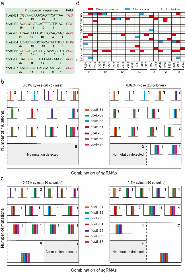 该研究聚焦构筑高版本底盘细胞这一合成生物学领域的核心问题,在前期研究基础上,进一步将碱基编辑器的单碱基转换的功能扩展至双碱基、多位点同步编辑功能。研究以枯草芽孢杆菌为底盘,首先将来源于Petromyzon marinus的胞嘧啶脱氨酶(PmCDA)、改造后的腺嘌呤脱氨酶ABE8e和nCas9蛋白通过不同组合的融合,获得了一系列具有不同编辑效率的编辑器CRISPR-ABE8e-CDA-nCas9,揭示了该编辑器能够在一个较宽的编辑窗口(8-11 nt)内同时发生高效的C→T和A→G的碱基转换。编辑窗口宽度及编辑效率能够通过诱导剂浓度、持续迭代等手段实现定向调节。更为重要的是,该编辑器还可同时靶向多个目标基因的不同靶位点进行同步编辑,利用不同靶位点突变的组合效应提升突变体基因型的多样性。经过NGS高通量测序,发现该系统的脱靶率极低,具有较好的靶特异性。通过对枯草芽孢杆菌ATP-binding cassette转运体基因psdB进行靶向编辑,在较小突变体库中即筛选得到Nisin抗性提升的突变菌株,效率相比单碱基编辑有显著提升。