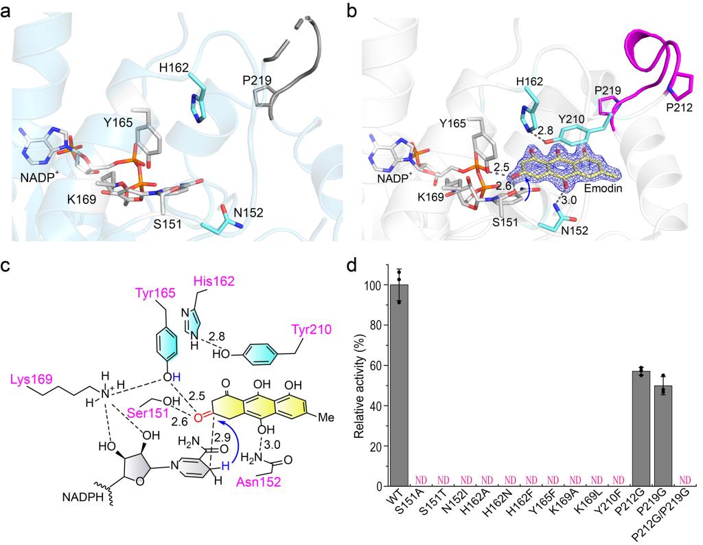 为了进一步研究蒽酚还原酶催化过程中的分子机制,作者解析获得了CbAR和CbAR-大黄素复合物的晶体结构。CbAR单体的结构包含9个α-螺旋和2组β-Sheet(β1-β7)(Fig. 2a)。单体结构比对结果表明,虽然CbAR和CbAR-大黄素复合物的Cα原子的rmsd为0.25,但aa209-216的loop区域明显不同(Fig. 2a, b)。这一区域在CbAR-大黄素复合物的结构中可见,而在CbAR结构中观察不到,这表明该区域在底物识别和结合中起着关键作用。表面轮廓图进一步表明该区域可能是底物识别和结合的“大门”(Fig. 2c)。为了更好地理解aa209-216区域对底物识别和结合的重要性,作者进一步分析了大黄素与CbAR之间的详细相互作用。晶体结构及体外实验表明,除了催化三联体(Ser151,Tyr165和Lys169)外,Asn152、His162, Tyr210, Pro212和Pro219在大黄素的底物识别、结合和稳定中也起着关键作用(Fig. 3)。