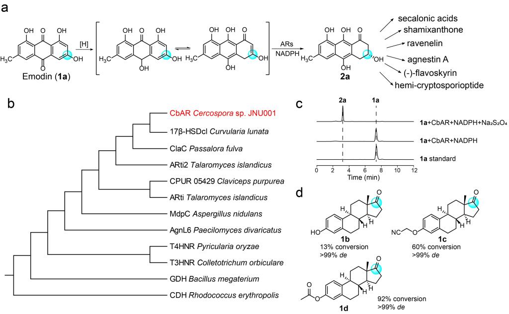 Figure 1.Identification of anthrol reductase CbAR with the ability to catalyze the reduction of emodin and estrones.