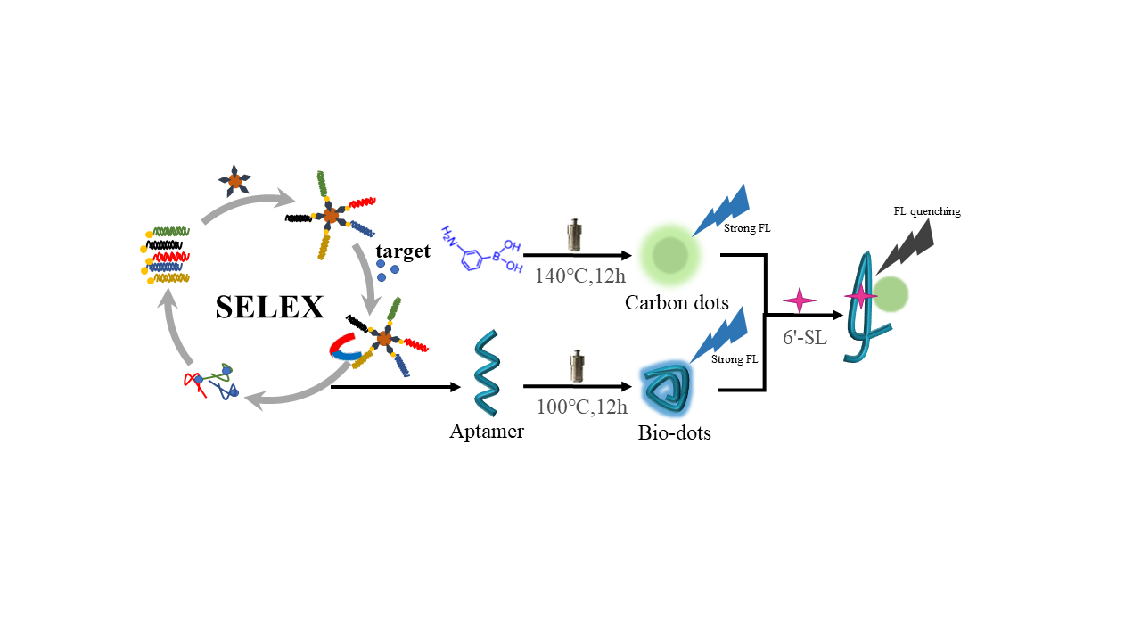 周楠迪教授团队针对现有唾液酸乳糖检测方法的局限性,设计了一对适配体生物量子点和氨基苯硼酸碳量子点,二者同时具备6'-SL识别能力和独特的荧光性质,被用于构建6'-SL荧光生物传感器。首先,利用实验室建立的磁珠-SELEX技术平台筛选了6'-SL的特异性ssDNA适配体。经过18轮筛选后获得的最佳候选核酸适配体(Kd=152.3 nM)利用基于结构预测和分子对接模拟的post-SELEX技术进行序列截短优化,获得截短后的最优适配体序列(Kd=91.75 nM)。然后,将该适配体序列制备成适配体生物量子点,该材料不仅保留了原有的6'-SL识别能力,还具备独特的荧光特性,并且其荧光强度在识别并结合靶标时会发生改变。结合使用氨基苯硼酸碳量子点,构建了一种新型6'-SL荧光生物传感器。该生物传感器的两种量子点均既可以作为生物识别元件,也可以作为信号探针,实现了传感元件的多功能集成,并显著地提高了该传感器的特异性。同时,该生物传感器操作简便、高效,对6'-SL检测的线性范围在10 μM至5 mM之间,其检出限为0.9 μM,且在加标实际样品检测中回收率和抗干扰能力较好。生命体系中糖类物质因其结构的复杂性,导致对其鉴定和定量分析具有较高的难度。本论文筛选的适配体识别元件及设计的多功能生物量子点,在糖类化合物的定性定量分析中具有良好的应用前景。