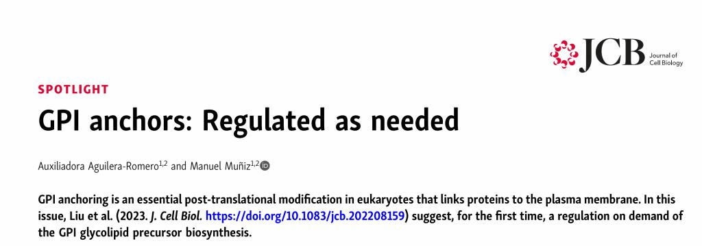 近日,西班牙塞维利亚大学(University of Seville)Manuel Muñiz教授及Auxiliadora Aguilera-Romero博士在国际高水平期刊Journal of cell biology上撰文(https://rupress.org/jcb/article/222/5/e202303097/214027/GPI-anchors-Regulated-as-neededGPI-anchors),专题报道世界杯官网青年教师柳艺石近期发表的GPI锚定蛋白相关研究工作(Liu et all,. J Cell Biol. 2023; 222(5): e202208159. https://doi.org/10.1083/jcb.202208159)。
