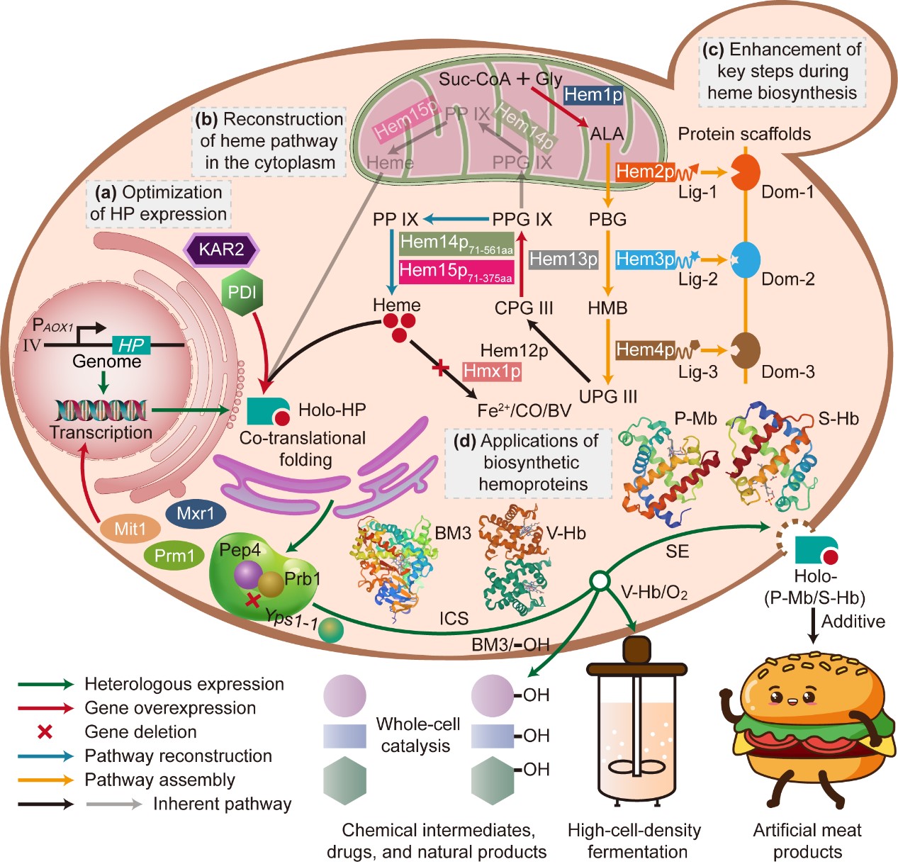 针对这些问题,世界杯官网食品合成生物学与生物制造团队研究人员通过增强P. pastoris底盘细胞中血红素的供给水平,实现了高活性血红素结合蛋白的高效合成。首先,通过考察不同P. pastoris宿主、基因拷贝数、发酵时间等条件对血红素结合蛋白中珠蛋白组分表达的影响,选择了合适的基于甲醇诱导的表达系统(PAOX1),并通过过表达PAOX1转录激活因子(Mit1、Mxr1与Prm1)、敲除蛋白酶(Yps1-1、Prb1与Pep4),强化了珠蛋白的转录和翻译水平并抑制其降解。最终在珠蛋白表达水平强化菌株P1中,P-Mb、S-Hb、V-Hb与P450-BM3的产量分别达到了162.46 ± 11.12 mg L-1、184.35 ± 17.14 mg L−1、32.32 ± 5.94 mg L−1与28.31 ± 5.44 mg L−1。