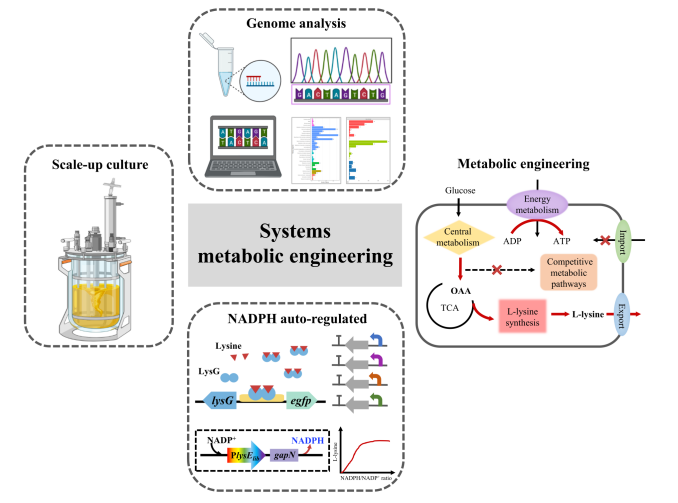 张伟国教授团队通过系统代谢工程设计了高效生产L-赖氨酸的谷氨酸棒杆菌。首先,碳通量被重排进入L-赖氨酸合成途径。通过增加前体物草酰乙酸的可用性,L-赖氨酸产量提高了8.7%。L-赖氨酸核心合成途径关键酶基因的表达被增强,导致工程菌株LYS-3的L-赖氨酸产量可达55.6 g/L。同时,工程菌株LYS-4中竞争代谢产物途径的削弱导致其产量进一步增加12.4%。谷氨酸棒杆菌需要足够的ATP来进行细胞代谢和L-赖氨酸的合成和运输。为了增加ATP供应构建了一系列工程菌株,最佳工程菌株LYS-4.3/Δamn的L-赖氨酸产量在摇瓶中达到67.8 g/L。通过改善产物运输系统,谷氨酸棒杆菌LYS-5的L-赖氨酸产量被进一步提高到69.3 g/L。此外,构建了可动态响应赖氨酸浓度的启动子库,并应用于调节非磷酸化NADP依赖性甘油醛3-磷酸脱氢酶,以使细胞实现自动优化细胞内NADPH池。最终设计的谷氨酸棒杆菌LYS-6在5 L发酵罐中L-赖氨酸产量可达223.4 g/L,糖酸转化率为0.68 g/g葡萄糖。本研究为已报道的L-赖氨酸的最高产量,这种系统代谢工程与动态调控相结合的策略可广泛用于构建高效的微生物细胞工厂,生产有价值的产品。
