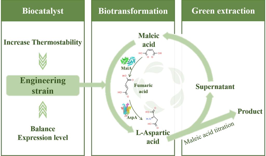 L-天冬氨酸具有广泛的用途和应用范围,广泛应用于各行各业。天冬氨酸的合成涉及化学合成和生物催化。化学合成具有一定的优势,包括工艺简单、收率高,但需要在高温高压下反应。为了克服化学合成的局限性,课题组先前已经开发了一个从顺丁烯二酸酐通过双酶偶联催化生物合成L-天冬氨酸的系统,然而在催化过程中观察到这两种酶的利用不平衡,需要通过调节双酶酶活比例来达到系统的最大利用率。此外工业提取天冬氨酸所用的硫酸会造成环境污染,对于这一工艺流程进行优化可以提高经济效益、减少污染。