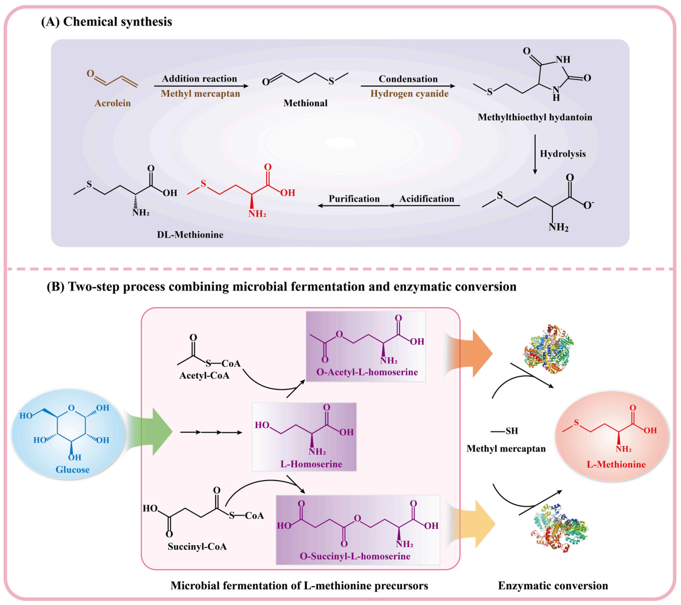 L-甲硫氨酸是一种必需氨基酸,广泛应用于食品、饲料、化妆品和医药等行业。近年来,随着代谢工程和合成生物学的快速发展,大多数氨基酸的工业化生产都可以通过微生物发酵法实现,然而,L-甲硫氨酸因其复杂的生物合成途径和严格的调控机制,目前实现它的微生物高效生产还面临着巨大的挑战。此外,利用微生物法生产L-甲硫氨酸的前体物质L-高丝氨酸、O-琥珀酰-L-高丝氨酸和O-乙酰-L-高丝氨酸的研究也受到广泛关注,因为它们可以通过体外高效的酶促反应生成L-甲硫氨酸,这也是一种非常具有前景的L-甲硫氨酸生产方法。