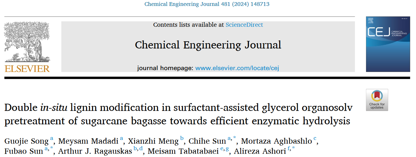 近期,我校世界杯官网孙付保教授团队在研究先进预处理方法促进纤维质底物酶解制糖方面取得重要进展,研究成果“Double in-situ lignin modification in surfactant-assisted glycerol organosolv pretreatment of sugarcane bagasse towards efficient enzymatic hydrolysis”正式发表于Chemical Engineering Journal, 2024, 481:148713 (一区, Top, IF 15.1)