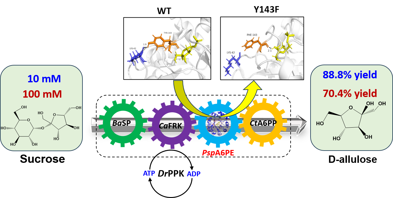 倪晔教授团队了构建体外多酶级联合成D-阿洛酮糖的路径,主要包含:蔗糖磷酸化酶(SP)、果糖激酶(FRK)、D-阿洛酮糖-6-磷酸3-差向异构酶(A6PE)和D-阿洛酮糖-6-磷酸磷酸酶(A6PP)。分别对不同来源的SP和A6PE进行筛选,选取热稳定性较高的来源于Bifidobacterium adolescentis(BaSP)和催化效率较高的来源于Pantoea sp(PspA6PE)。FRK和A6PP选择文献报道的催化效率较高的来源于Clostridium acetobutylicum(CaFRK)和Clostridium thermocellum(CtA6PP)。最后通过单因素对照试验确定该路径的限速酶为A6PE。通过对PspA6PE底物结合口袋附近关键残基进行丙氨酸扫描和定点饱和突变,筛选到突变体Y143F,10 mM蔗糖合成D-阿洛酮糖的产率为88.8%。引入ATP再生系统后,ATP浓度降至0.5 mM后,反应12 h产率为83.0%。扩大底物(蔗糖)浓度至50和100 mM,产率分别达到82.8%和70.4%。本研究为D-阿洛酮糖提供一种高效和廉价的体外合成方法。