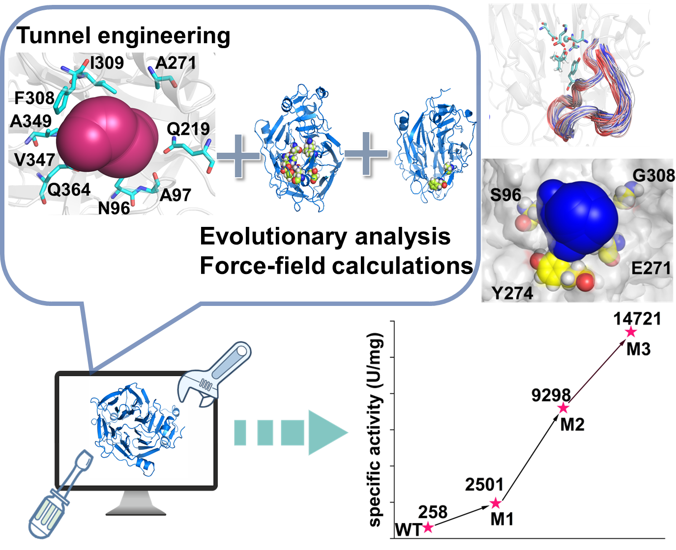 针对以上问题,该团队采用组合策略,整合了底物通道工程、进化分析和力场计算,以提高D-泛解酸内酯水解酶(D-Lac)的活力,最终获得了最佳突变体N96S/A271E/F274Y/F308G(M3),其催化效率(kcat/KM)比野生型高23倍,使用突变体M3全细胞可将浓度为20%的DL-泛解酸内酯转化为D-泛酸(D-PA,>99% e.e.),转化率达47%,时空产量为107.1 g L−1h−1,表明其在工业大规模生产D-泛酸的巨大潜力。分子动力学(MD)模拟显示,突变体M3的活力提升是在底物通道内部消除了空间位阻,并通过远端Loop的构象重塑使“催化”构象更有利,使得底物和酶更易进入它们的预反应状态。本研究阐明了D-Lac底物通道入口处关键Loop上远端残基的潜在作用,使其成为能够重塑能量格局并因此影响酶活性的新型修饰热点。