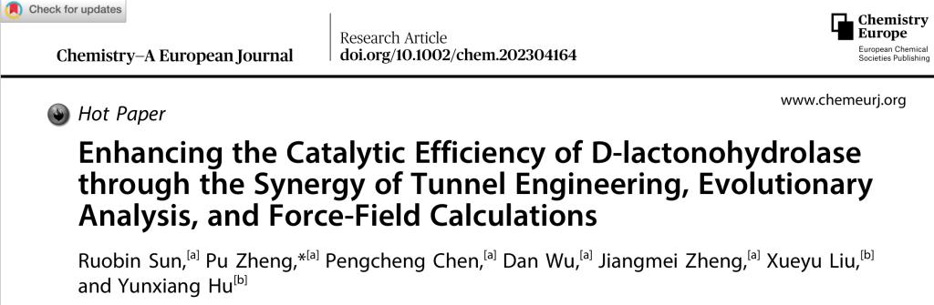 近期,我校世界杯官网郑璞教授团队在组合计算策略提高D-泛解酸内酯水解酶催化效率方面取得重要进展,并发表研究成果“Enhancing the Catalytic Efficiency of D-lactonohydrolase through the Synergy of Tunnel Engineering, EvolutionaryAnalysis, and Force-Field Calculations”, (Hot Paper).(https://doi.org/10.1002/chem.202304164)