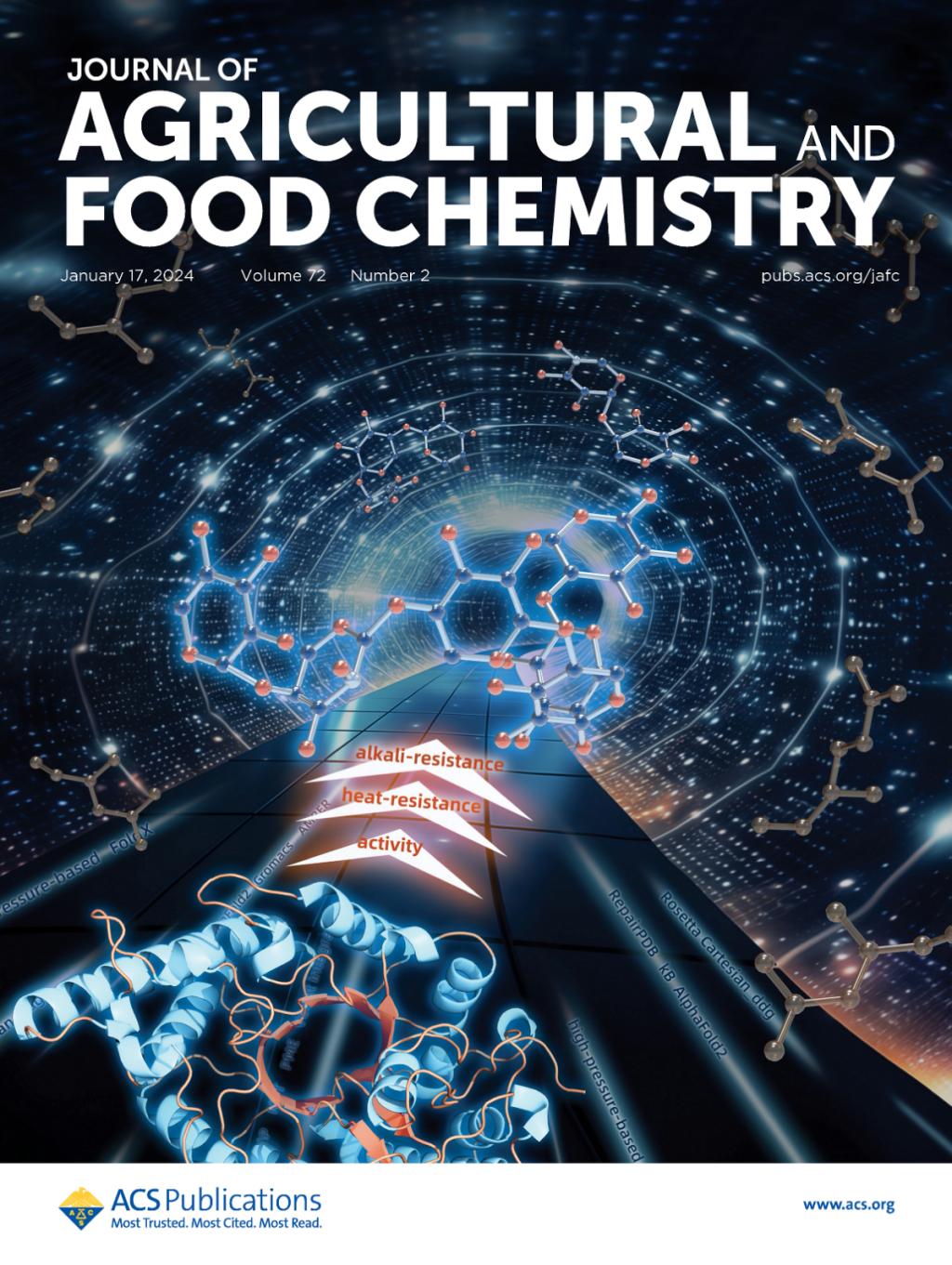 近期我校世界杯官网工业生物技术教育部重点实验室夏小乐教授团队在耐热耐碱木聚糖酶的改造与应用研究取得新进展,研究结果“Computer-Aided reconstruction and application of Bacillus halodurans S7 xylanase with heat and alkali resistance”封面正式发表于Journal of Agricultural and Food Chemistry (Top期刊、SCI一区期刊,IF=6.1) (https://doi.org/10.1021/acs.jafc.3c08221)。