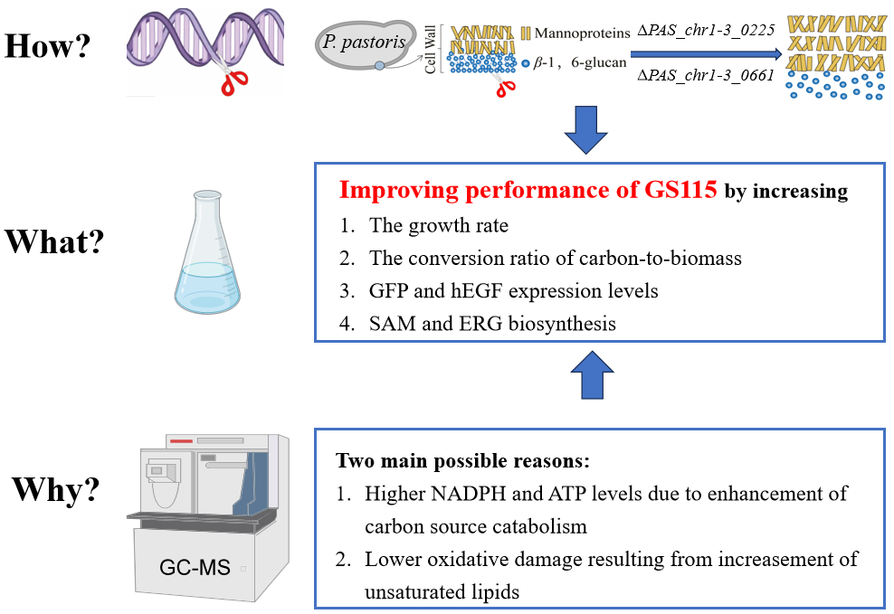 基于可持续生物制造的诉求,利用底盘工程设计策略来提高毕赤酵母宿主性能已成为研究焦点。如Weinhandl等人对Cwp1、Scw10和Och1失活,从而增加支链氨基酸转移酶的分泌,提高糖基化蛋白质水平,改造后的细胞壁粘度降低,结构更具渗透性。Näätsaari等人通过删除KU70同源物(一种对NHEJ至关重要的DNA末端结合蛋白),显著提高同源重组效率达90%以上。但目前尚无针对底盘细胞细胞壁的修饰改造。酵母细胞壁主要是由多聚糖组成(葡聚糖和甘露聚糖),其约占细胞壁干重的85%-90%,这些多聚糖一方面消耗了大量碳源,降低了碳源对产物的转化率,另外一方面,束缚了细胞尺寸,对细胞诸多特性产生了一定程度的限制。