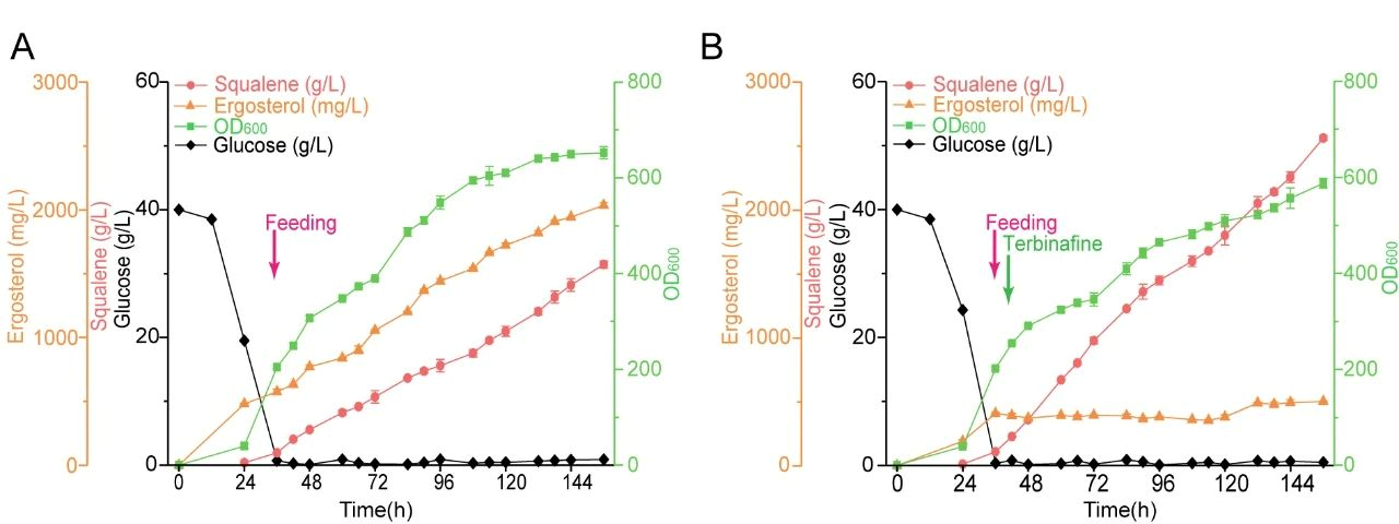 角鲨烯(Squalene)是一种高价值无环三萜化合物,常被用作抗氧化剂、抗肿瘤剂、疫苗佐剂等,广泛应用于食品、化妆品、医疗行业。角鲨烯可从鲨鱼肝油、橄榄、苋菜籽等动植物中分离获得,但由于动物保护法规以及植物中提取纯化的繁琐工艺,这类生产方式有很大的局限性。近年来,随着对基因编辑工具和代谢模型的不断挖掘,人们尝试在微生物中构建细胞工厂以持续、高效、安全的合成角鲨烯。然而,目前的研究中甲羟戊酸(MVA)途径碳通量不足、胞质中疏水性大分子储存空间有限、脂质合成和角鲨烯合成的竞争等因素限制角鲨烯在微生物中的高效合成。解脂酵母(Yarrowia lipolytica)是一种Crabtree阴性酵母,具有底物谱广、脂质含量丰富、适应高密度发酵等特点。解脂酵母的过氧化物酶体是利于角鲨烯储存的疏水性细胞区室,其中存在的β-氧化途径是产生乙酰辅酶A的重要代谢过程,因此,过氧化物酶体有潜力被开发为角鲨烯的“生产车间”。