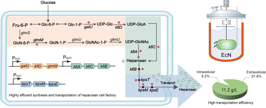 康振教授团队针对优化肝素前体的生物合成和转运,从而实现有效的细胞外分布——本研究以益生菌EcN为平台菌株,首先通过蛋白共定位肝素前体合成基因簇区域II蛋白KfiB在EcN菌中的位置和生物学作用,鉴定KfiB在肝素前体生物合成中的功能,在证明了KfiB在肝素前体生物合成中的关键作用并参与肝素前体的转运过程后,进一步筛选不同强度的核糖体结合位点(ribosome binding site,RBS)重构了kfiABC基因表达盒;鉴于肝素前体在细胞内的积累,随后优化合成与转运之间的联系实现肝素前体的高效合成与转运调控,其中ABC转运蛋白KpsTM和KpsE组合优化时与KfiACB的协同上调显著促进了肝素前体的转运,使摇瓶内肝素前体浓度提高到1.03 g/L,细胞外浓度为0.96 g/L。最后,增加前体UDP-糖代谢通量、优化合成及转运组分获得的重组菌株在5-L发酵罐中放大生产,肝素前体的总产量达到12.22 g/L,分泌效率达到了91.81%,具有更高的肝素前体产率及胞外分布。结果表明,肝素前体生物合成过程中聚合与转运协同优化策略是高效可行的。该工程菌株也具有大规模生产肝素聚糖的潜力。
