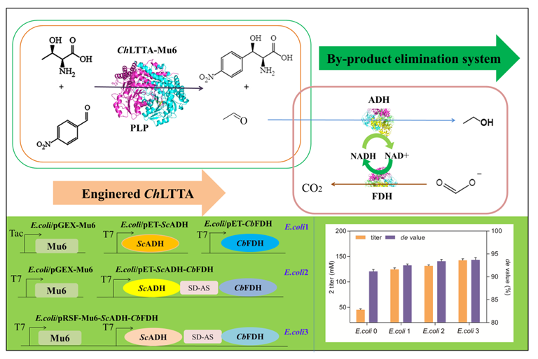 氯霉素是一种有效的广谱抗生素,用于治疗伤寒和副伤寒疾病。在工业生产中,氯霉素目前是通过9步化学工艺生产的,收率不到30%。近年来研究者越来越关注探索氯霉素的环保高效生物合成途径。氯霉素的关键中间体为L-苏-对硝基苯丝氨酸,是β-羟基-α-氨基酸一种,其侧链含有两个手性中心。而L-苏氨酸转醛酶(LTTA)以L-苏氨酸与苯甲醛衍生物为底物,通过醛醇缩合反应一步构建两个立体中心,生成具有两个手性的β-羟基-α-氨基酸。但是由于其活性低,Cβ立体选择性差以及副产物乙醛抑制等问题,导致β-羟基-α-氨基酸的产量提升受限。因此,对L-苏氨酸转醛酶的改造以及解除副产物抑制是实现β-羟基-α-氨基酸高效生产的必经之路。