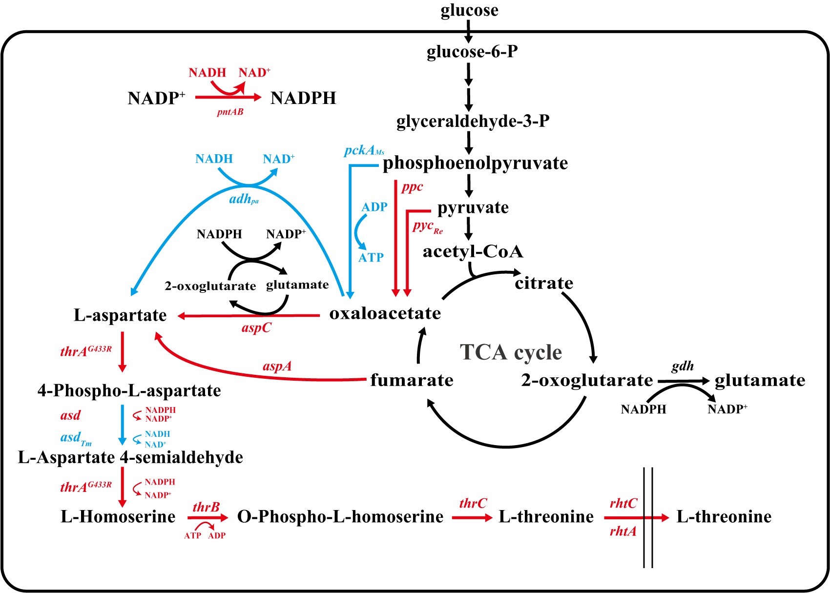 L-苏氨酸作为一种必需的营养氨基酸,广泛应用于动物饲料中,以提高肉质,降低养殖成本,在氨基酸市场中占有巨大的市场份额。随着合成生物学和基因编辑技术的快速发展,通过系统代谢工程对微生物进行重编程以高效地产生目标化学物质已经取得了重大成就。近年来,利用多模块重编程策略在野生型大肠杆菌中实现了L -苏氨酸的过量生产。 但与 L-赖氨酸和 L-谷氨酸相比,目前的生产水平仍有差距。因此,开发具有工业化潜力的 L-苏氨酸细胞工厂将带来巨大的经济价值。