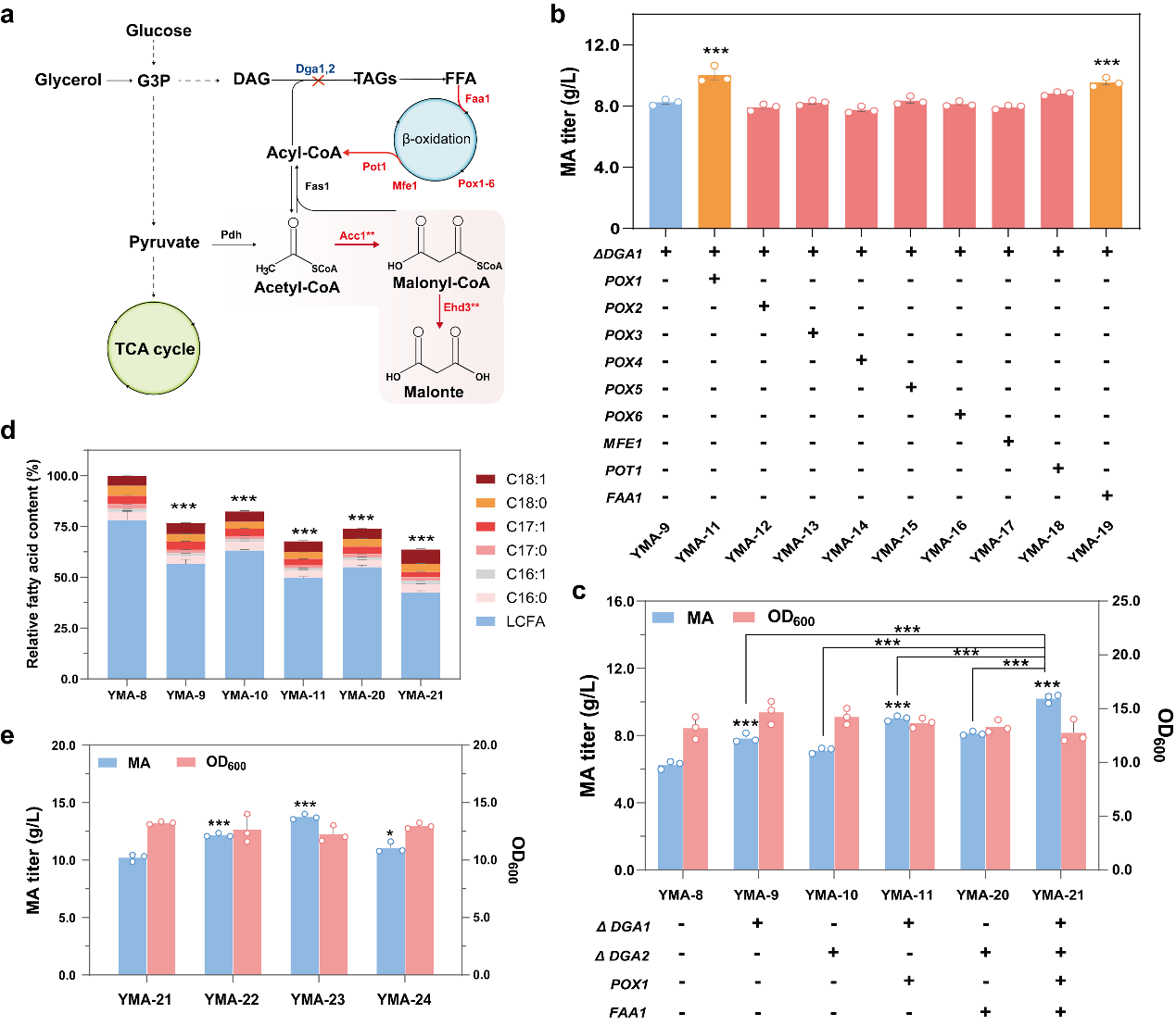 世界杯官网邓禹教授课题组选取耐酸性能力强、丙二酸前体丙二酰辅酶A高代谢通量的解脂耶氏酵母为底盘细胞,通过筛选丙二酸生物合成过程中的关键酶丙二酰辅酶 A 水解酶设计构建了基于丙二酰辅酶A途径合成丙二酸的工程菌株。首先,通过在解脂耶氏酵母中构建 3 种不同的合成途径评估了丙二酸合成能力,验证了来自酿酒酵母的丙二酰辅酶A水解酶Ehd3**途径效率最高。为进一步提升 MA 的产量,从解脂耶氏酵母和尖孢镰刀菌中鉴定出两种具有高催化活性的新型丙二酰辅酶 A 水解酶,其中表达尖孢镰刀菌丙二酰辅酶 A 水解酶FoEhd3**可使丙二酸产量提高至 6.3 g/L。随后,通过对工程菌株进行代谢改造,确保前体乙酰辅酶 A 和丙二酰辅酶A有充足的通量用于丙二酸的生产,在摇瓶培养中丙二酸产量达到 13.8 g/L。最后,通过优化发酵条件并在 5L 发酵罐中进行高密度发酵,以甘油为初始碳源,在初始培养基中甘油耗尽后,采用恒速进料策略,发酵156 h 时,丙二酸的最高产量达到 63.6 g/L,产率为 0.41 g/L/h。本研究为工程化解脂耶氏酵母生产丙二酸提供了一种绿色、高效的合成方法,为丙二酸的工业化生产提供了可能。