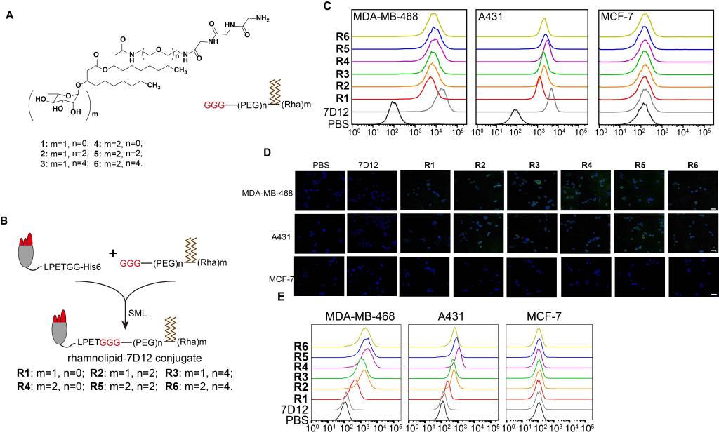 纳米抗体具备特异性强、亲和力高、稳定性好、免疫原性低和易于生产等特点,已被广泛应用于开发新的肿瘤免疫治疗策略。然而,纳米抗体不具有传统抗体的Fc结构,以及血清半衰期短等问题,严重影响其药效的发挥。因此,为解决此问题,研究团队合成了不同Rha单元和PEG接头的化合物1-6(图2A),并通过Sortase A介导的连接反应将它们分别修饰到EGFR纳米抗体7D12的C末端,获得了相应的7D12-rhamnolipid偶联物R1-R6(图2B)。亲和实验和抗体募集实验结果显示,6种偶联物均保留了良好的EGFR特异性识别能力(图2C),且能够选择性地将抗Rha抗体重定向至靶细胞表面(图2D-E)