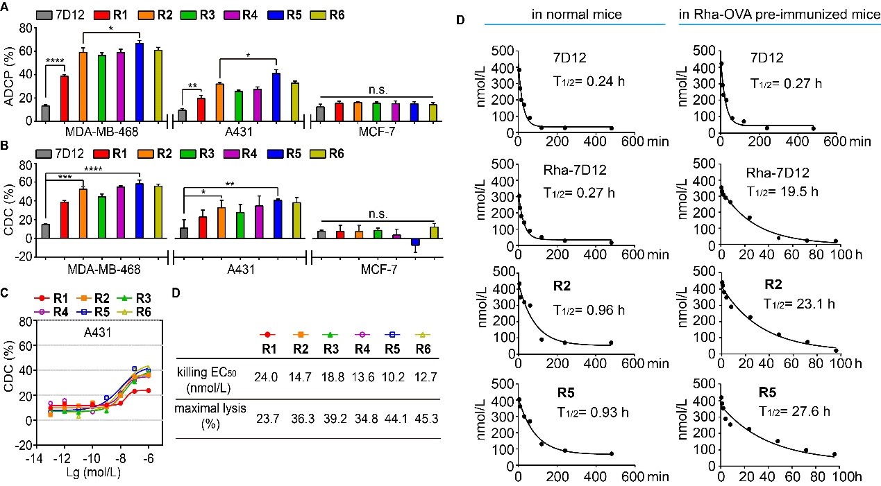 体外活性结果表明,偶联物引发的免疫效应功能水平与其所含的Rha数目和PEG接头的长短均相关,Rha数目为2且PEG长度为2的偶联物R5呈现出最高的CDC和ADCP水平(图3A-C);且体内药代动力学实验表明,R5的半衰期显著增长,因为它能够与血清白蛋白和内源性抗Rha抗体结合(图3D)。