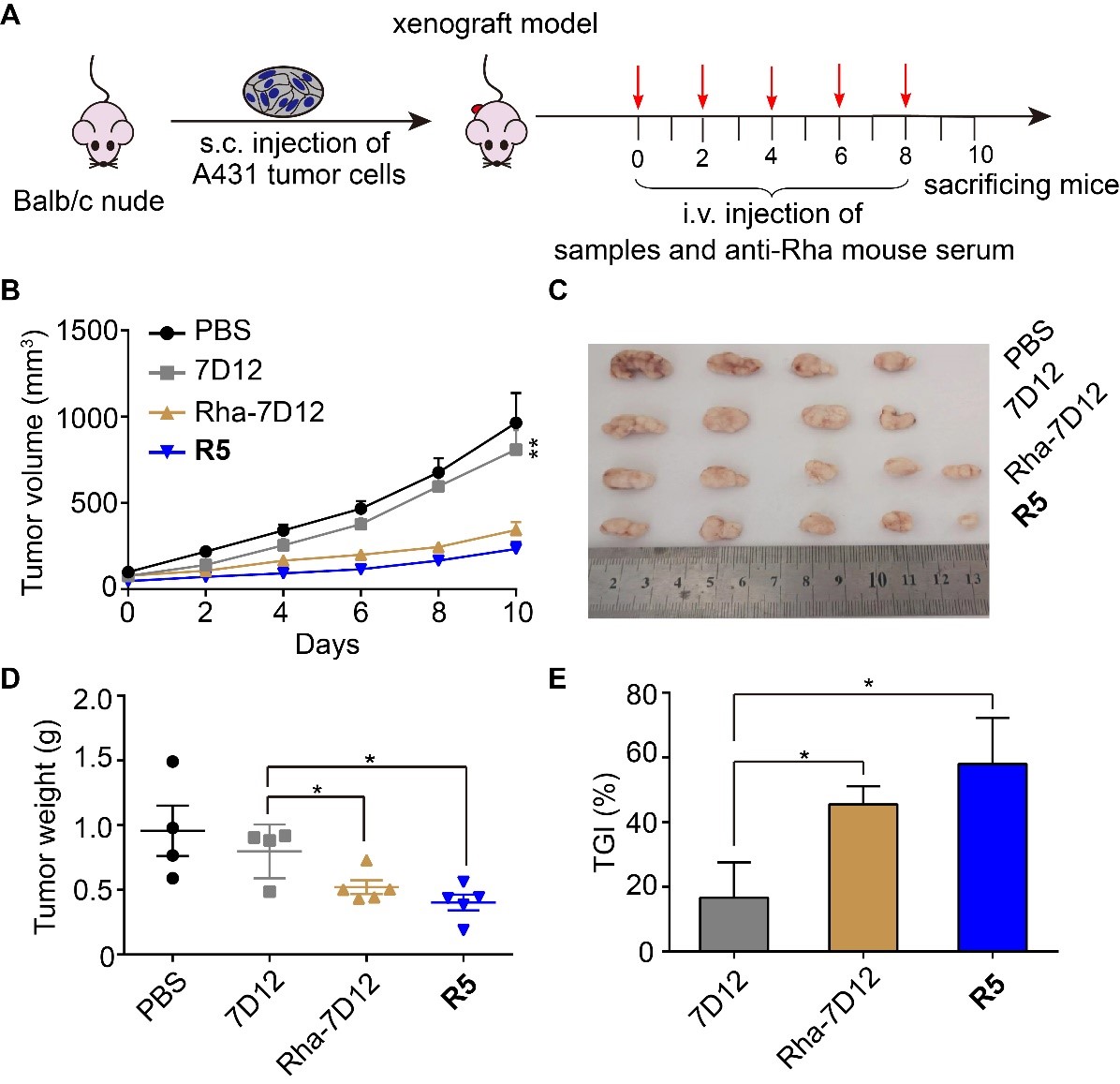 图4 偶联物R5和Rha-7D12的体内抗肿瘤活性评估