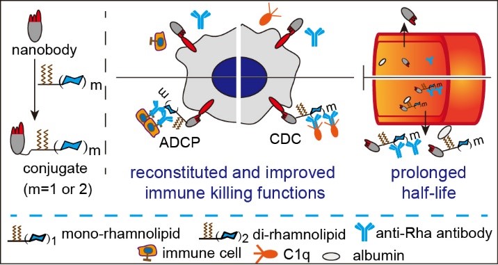 该研究利用鼠李糖脂(Rhamnolipid)能与白蛋白结合并同时具有良好的抗鼠李糖(Rha)体募集能力,基于化学酶法制备了一系列可以进一步延长纳米抗体半衰期和增强Fc效应功能的纳米抗体-鼠李糖脂偶联物,并对其构效关系进行了解析研究(图1)。