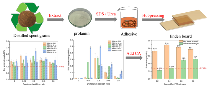 酒糟(DSG)是白酒生产中最大的副产品。为了多样化利用DSG中剩余的丰富营养物质,使其具有高附加值。徐岩教授团队范文来课题组创新性地探索了DSG制备prolamin-based adhesive (PBA)的可能性。用十二烷基硫酸钠(SDS)和尿素对浓香型(SA)、酱香型(SSA)和清香型(LA) 3个香香型品种的醇溶蛋白进行了改性。结果表明,蛋白中疏水氨基酸的高含量保证了PBA具有较强的耐水性。并且经过SDS改性的胶黏剂综合性能更好,清香型酒糟胶黏剂在胶合强度方面,干抗剪强度最大,为2.24 MPa,而酱香型酒糟胶黏剂耐热性及耐水性更好。为了进一步提高PBA-SSA-SDS的耐水性,成功地将交联剂(CA)掺入PBA中进行化学交联反应,获得了比原始胶粘剂提高了300 %的湿抗剪切强度,干/湿抗剪切强度均达到国标Ⅰ型木质胶合板的要求(中国标准GB/T 9846-2015《刨花板》,以及WSAD测试通过美国硬木和装饰胶合板国家标准(ANSI/HPVA HP-1-2024))。本研究为酒糟转化为木材胶粘剂提供了理论基础与实践指导,证明PBA的可持续发展和高附加值应用是可行的,将为白酒厂带来新的经济效益、环境效益和社会效益。