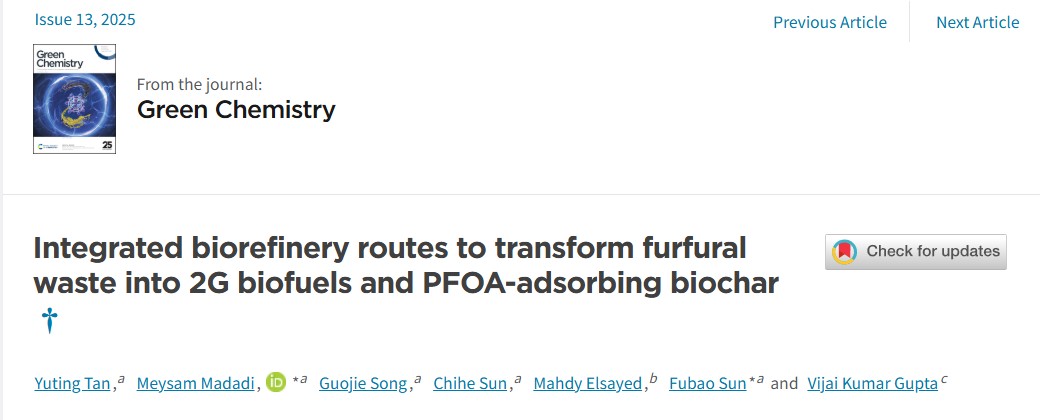 近期,我校世界杯官网生物资源与生物炼制研究团队在糠醛渣生产加工的纤维类副产物增值利用方面取得重要进展,研究成果“Integrated biorefinery routes to transform furfural waste into 2G biofuels and PFOA-adsorbing biochar”正式发表于Green chemistry(一区, Top, IF 9.3)。
