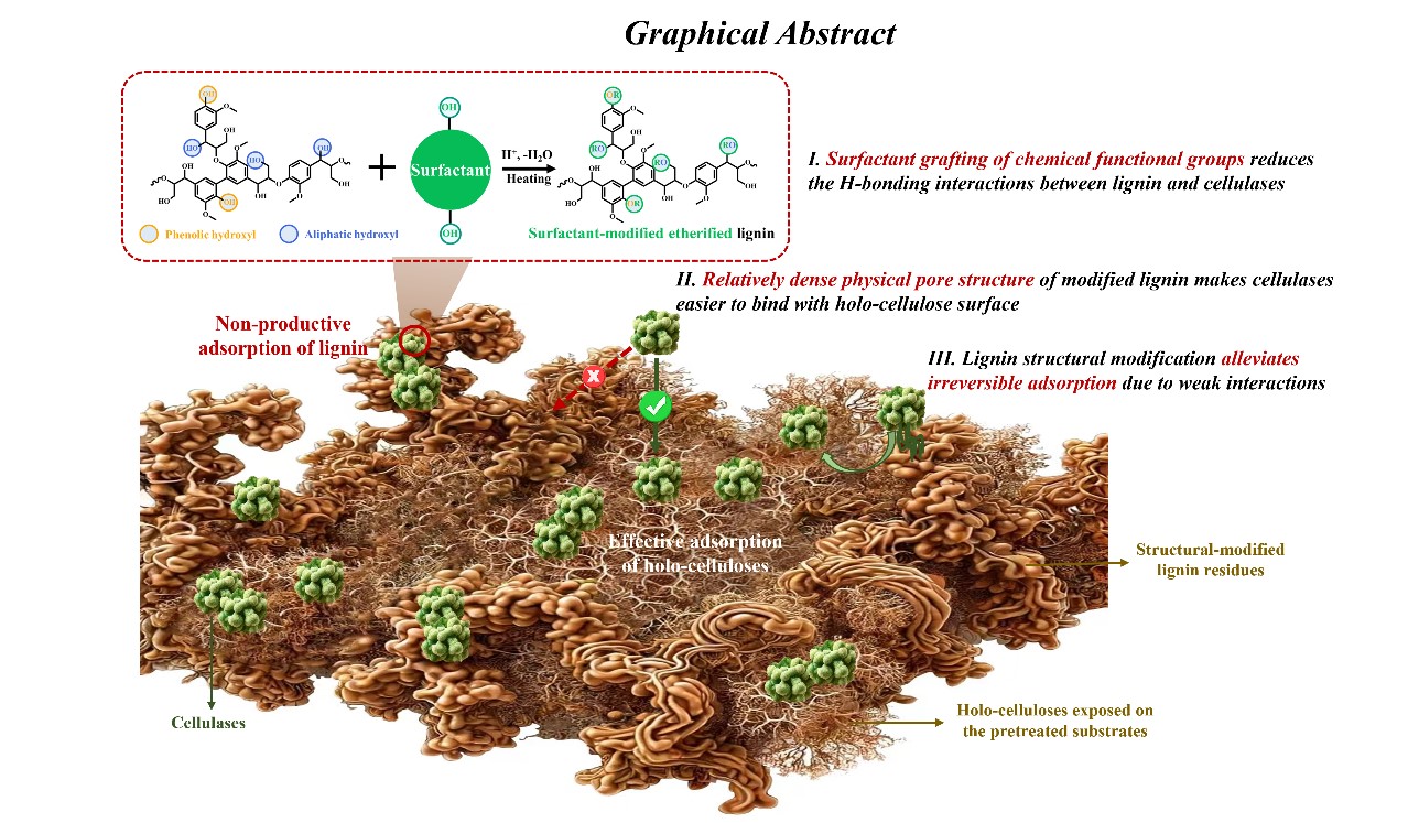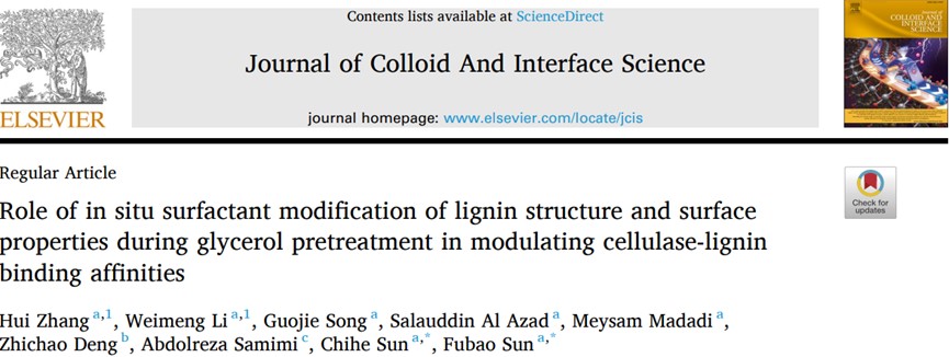 近期,我校世界杯官网生物资源与生物炼制研究团队在表面活性剂修饰型预处理增效纤维质酶解作用方面取得重要进展,研究成果“Role of in-situ surfactant modification of lignin structure and surface properties during glycerol pretreatment in modulating cellulase-lignin binding affinities”正式发表于Journal of Colloid And Interface Science(一区, Top, IF 9.4)。