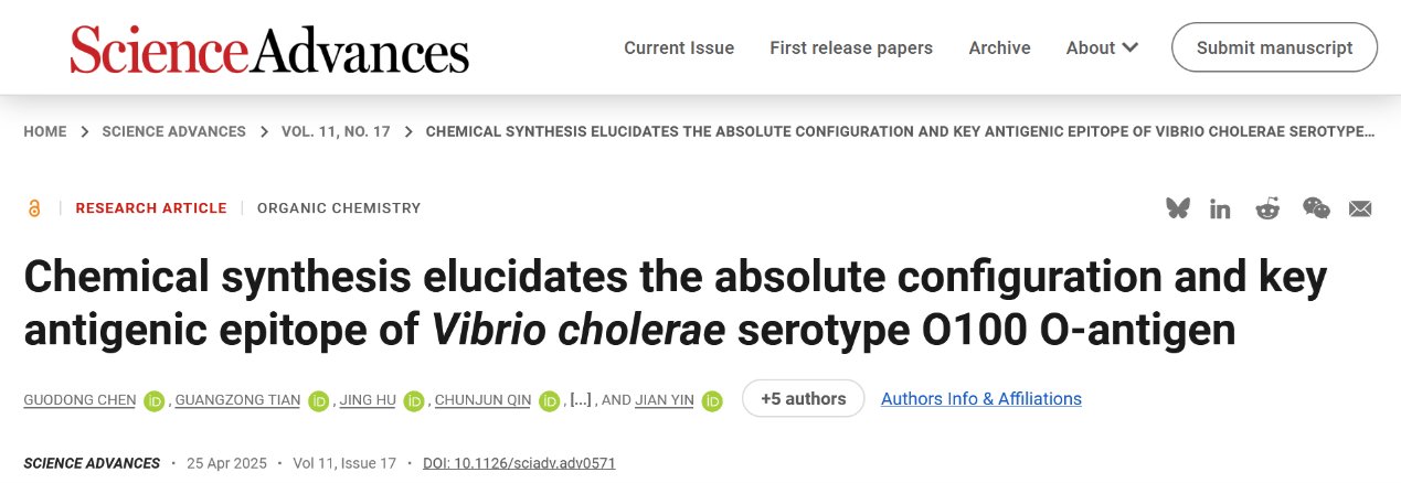 近期,世界杯官网、糖化学与生物技术教育部重点实验室尹健教授团队在致病菌糖链抗原的全合成及抗原性研究方面取得新进展,研究成果“Chemical Synthesis Elucidates the Absolute Configuration and Key Antigenic Epitope of Vibrio cholerae Serotype O100 O-Antigen”发表于Science Advances(https://doi.org/10.1126/sciadv.adv0571)。