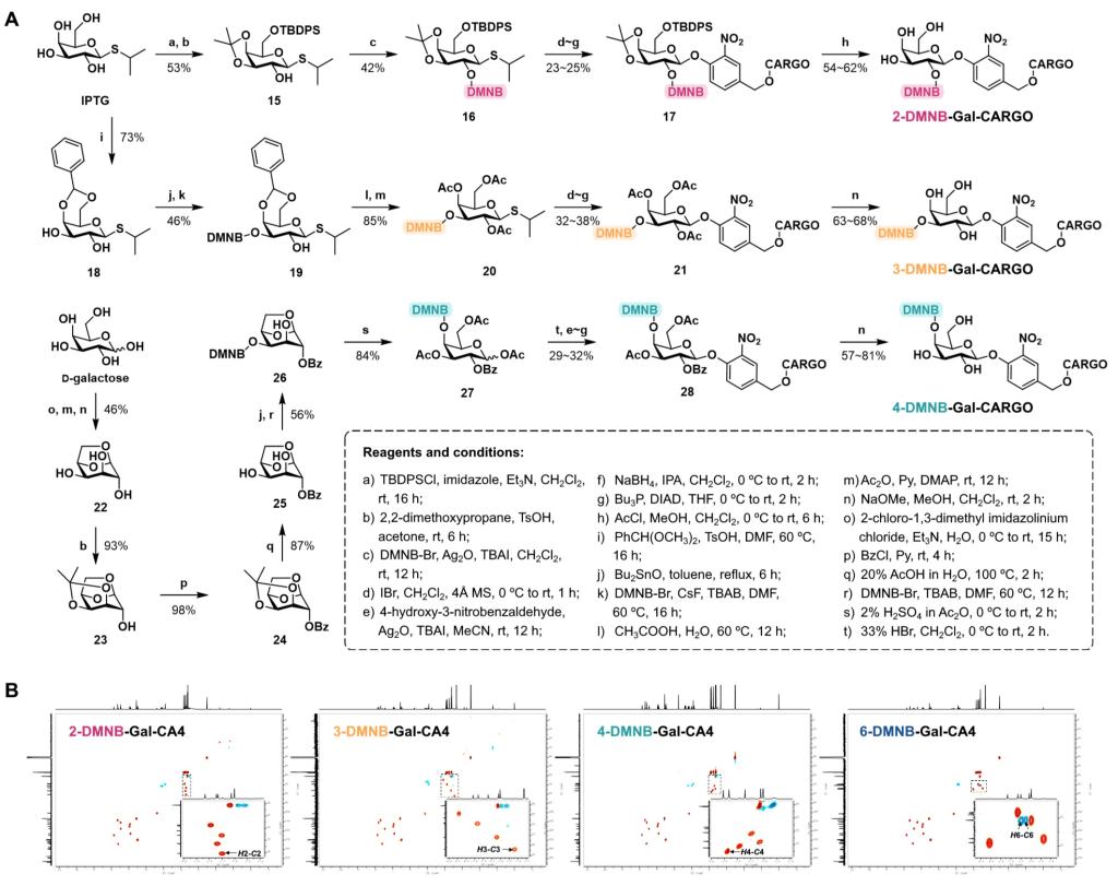 接下来,作者将修饰位点从6位羟基扩展到半乳糖的2、3、4位羟基,基于糖化学正交保护策略,构建了O2、O3、O4和O6光笼集团修饰的半乳糖苷前药的合成通法(图4),并对不同羟基修饰的半乳糖苷前药的位置异构体开展了系统的构效关系研究。结果提示,O2和O6修饰的半乳糖苷的UV/β-gal双重依赖性显著高于O3和O4修饰的异构体。作者最后选择双前药2-DMNB-Gal-CA4和6-DMNB-Gal-CA4进行重点比较。细胞实验和斑马鱼实验证明,与6-DMNB-Gal-CA4相比,双前药2-DMNB-Gal-CA4经UV/β-gal双重响应展现出更优异的抗肿瘤活性。