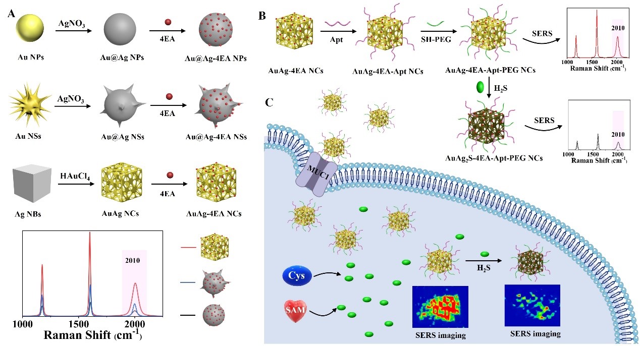 周楠迪教授团队开发了一种靶向型SERS探针,实现了活细胞内H2S的定量检测与SERS成像分析(图1)。首先成功制备了三种形貌各异的金银复合SERS基底(银包金纳米球(Au@Ag NPs)、银包金纳米星(Au@Ag NSs)以及AuAg NCs)(图2),这些基底兼具优异的等离子体活性、稳定性和生物相容性。随后通过拉曼信号分子4-乙炔基苯胺(4EA)修饰后,发现AuAg-4EA NCs在位于细胞静默区的2010 cm-1处表现出最强的拉曼增强效应。在H2S和氧气存在条件下,AuAg-4EA NCs中的Ag与H2S快速反应生成拉曼增强性能显著降低的Ag2S,导致4EA信号强度急剧衰减。且随着H2S浓度升高,Ag2S生成量增加,据此建立了H2S浓度依赖的定量检测模型。进一步通过粘蛋白1适配体(MUC1 Apt)与聚乙二醇(PEG)功能化修饰,开发出具有肿瘤靶向能力的SERS探针。该探针通过MUC1 Apt特异性识别MUC1阳性肿瘤细胞,继而通过Ag与H2S的选择性快速反应,成功实现了对活细胞内外源性及内源性H2S的高对比度成像(图3)。