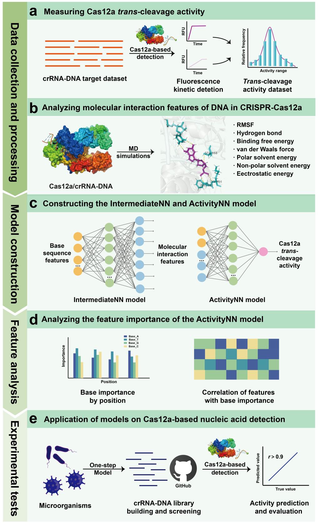 传统的crRNA设计依赖于经验性与试错性实验分析,既费时又耗资源。为了解决这一问题,吴群教授和聂尧教授等人提出了一种结合分子动力学模拟和神经网络模型的新方法来预测不同crRNA的Cas12a反式切割活性。该方法整合了CRISPR-Cas12a系统中DNA的序列特征和分子相互作用特征,显著提高了预测准确性(R2 =/info/1021/ /0.9455)。通过特征值重要性分析,确定了影响Cas12a反式切割活性的关键序列特征。此外,该研究还建立了一个针对细菌、真菌、病毒等446个物种的crRNA序列文库,该文库可用于446个物种的CRISPR-Cas12a系统体外核酸检测(预测准确性Pearson’s r =/info/1021/ /0.9328)。这项研究阐明了Cas12a/crRNA-DNA的分子相互作用机制,将促进CRISPR-Cas12a系统在快速核酸诊断中的应用。