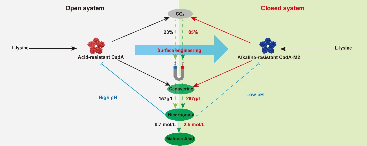 二氧化碳(CO₂)是一种主要的温室气体,其大量排放正引发全球变暖、极端天气等严峻的气候问题。尽管化石燃料的燃烧是CO₂的主要来源,但生物过程同样在全球碳排放中占据重要比例。特别是生物呼吸、生物氧化等自然或人工生物活动所产生的CO₂,具有排放分散、持续释放的特点,使得传统捕集技术在实际应用中面临效率低、成本高等挑战,成为当前减排工作的一大难题。例如,快速发展的生物基多胺——戊二胺(Cadaverine),目前主要通过微生物催化L-赖氨酸的脱羧反应获得。该工艺以可再生资源为原料,虽然具备绿色制造优势,但其在合成过程中每转化1摩尔赖氨酸即伴随释放1摩尔CO₂,形成显著的碳排放压力。据估算,全球戊二胺年产能所产生的CO₂排放已超过24万吨,相当于约5万辆汽油车的年排放量。由于这类CO₂排放具有典型的生物源排放特征——分布广、浓度低、难以集中回收,在实际工业应用中往往直接排入环境,进而削弱了生物制造的可持续性优势。随着生物制造产业规模不断扩大,对其环境友好性提出了更高要求,亟需探索能够同步捕集并利用其反应过程中释放CO₂的策略,从源头提高碳利用效率,减少碳足迹。