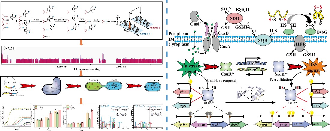 本研究以经实验室长期适应性进化的极端耐铜微生物A. caldus CCTCC M 2018727为研究对象。结合过硫化修饰蛋白组学技术,比较了极端铜胁迫前后蛋白质过硫化程度差异。挖掘出一个与铜耐受性和活性硫化物(RSS)代谢相关的MarR家族转录因子SscRAc。基于CRISPR-Cas9基因编辑技术,构建sscRAc敲除突变株。通过比较敲除突变株与野生型菌株的生长表型和氧化还原状态差异,检验 SscRAc 在 A. caldus M 适应铜胁迫过程中的作用。ChIP-seq/qRT-PCR 表明,SscRAc 通过抑制铜外排和激活 RSS 代谢来调节铜的解毒过程。LC-MS/MS 分析显示,SscRAc 中的 Cys74 和 Cys78能够感应 RSS 并发生过硫化,导致蛋白质从靶基因的启动子上解离。最后,上游信号分析发现,由 SscRAc 调控的铜敏感阻遏蛋白 CsoRAc 能够反向调节SscRAc。CsoRAc 和 SscRAc 共同作用建立了一条铜- RSS 信号传导通路。该通路能够将铜胁迫信号转化为可被广泛蛋白质网络检测到的 RSS 信号。本研究将 A. caldus 铜耐受性模块与RSS代谢模块相关联,首次提出了A. caldus抵御极端铜胁迫的信号传导分子机制,扩展了对极端微生物铜耐受生命机制认识。