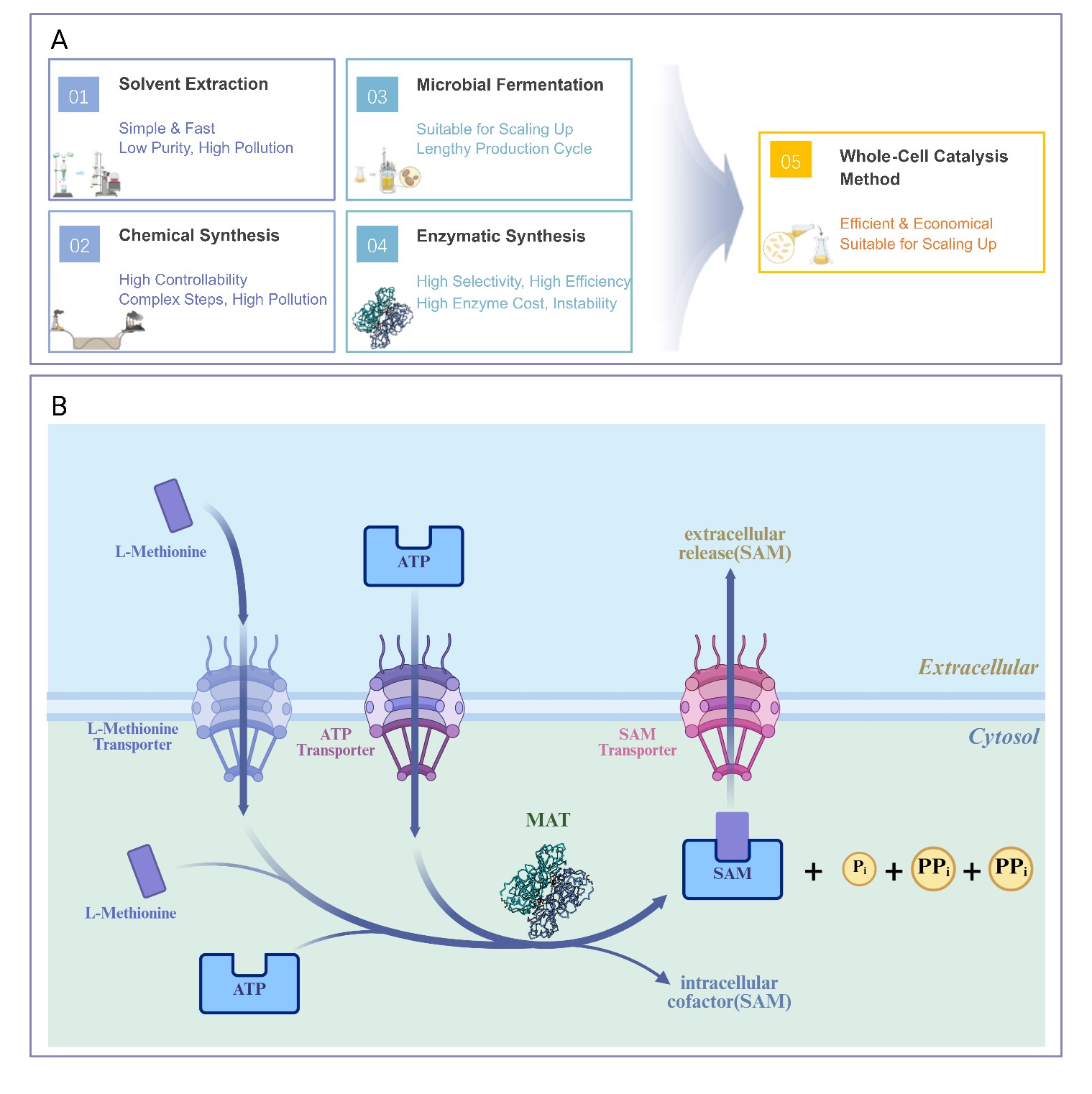 S-腺苷甲硫氨酸(SAM)是一种重要的代谢中间体,广泛应用于医药、农业和生物燃料等领域。传统的化学合成法污染严重、步骤复杂;微生物发酵法周期长、下游提取困难;酶法催化虽效率高但酶成本昂贵、稳定性差。因此,开发高效、绿色、适于放大的全细胞催化系统具有重要工业意义。