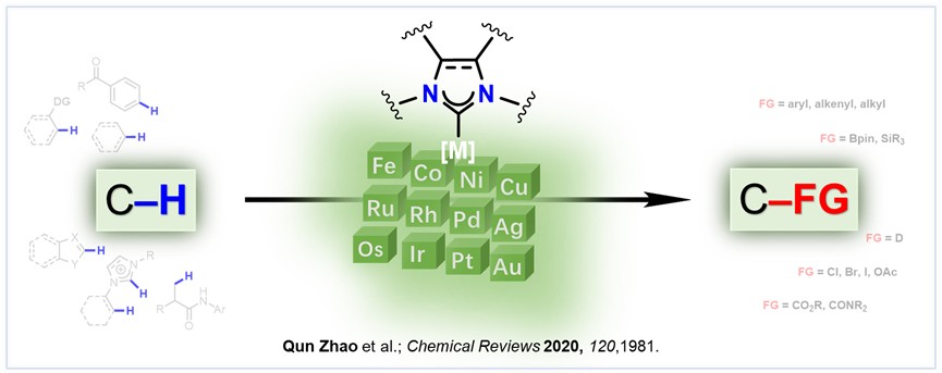自从1991年Arduengo第一次分离得到稳定的游离氮杂环卡宾以来,其作为一种高效的配体和催化剂得到了迅速的发展,由于氮杂环卡宾(NHC)的极性反转特性,它在有机合成中构建复杂分子的地位举足轻重。NHC通过卡宾碳原子与金属中心配位可以形成[NHC-M]配合物,NHC配体强大的给电子能力、卓越的稳定性和高度的可调性与过渡金属丰富的反应性相结合,催生出了一大批性能远超传统催化剂的明星分子,如Grubbs II代催化剂等。鉴于[NHC-M]在合成化学领域的广泛应用,赵群教授以第一作者身份综述了此类复合催化剂在合成化学相关领域的研究进展,该工作发表于Chemical Reviews(IF = 55.8) (DOI: 10.1021/acs.chemrev.9b00634)。