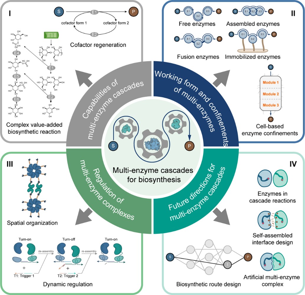 该综述聚焦于仿生多酶级联,文章从“级联合成能力—多酶构建形式—调控机制—未来方向”四个角度出发,全面探讨了多酶级联的应用潜力,强调了酶之间精确协调、底物通道的形成与动态调控对催化效率的提升。首先,综述介绍了多酶级联在廉价原料的高效利用、辅因子再生、共底物供应及生物质资源转化中的优势,例如利用多酶系统进行NAD+再生、消除过氧化氢抑制、提高糖基化效率等。此外,精妙的多酶级联生物合成强调了原子经济性、克服热力学限制和复杂化合物的简洁合成。其次,综述详细探讨了四种级联体系中多酶构建形式:游离酶、多酶组装复合物、融合酶和生物基(如蛋白质支架、核酸支架和细胞等)固定酶,以及在微环境限制下的单细胞级联、多细胞级联和人工隔室中的应用,强调了其在提高产物产量和催化效率方面的优势。之后,文章讨论了多酶复合体的空间组织形式与动态调控机制,如刺激响应型自组装及触发系统,提供了人工系统设计的灵感。最后,综述展望了AI辅助生物合成路径设计和人工多酶复合物理性构建的前沿技术,这些策略将推动多酶级联在工业化应用中的转型,实现可持续的生物制造。