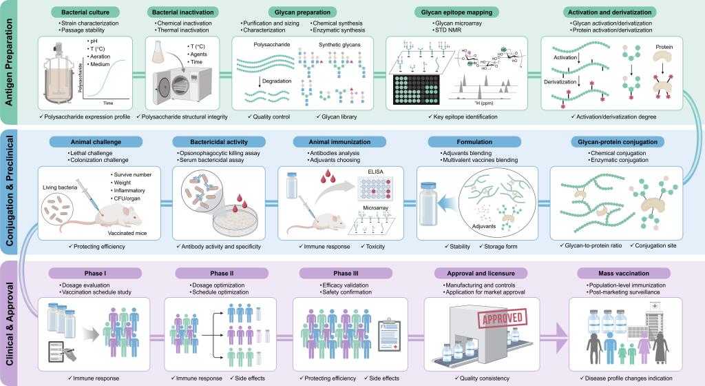 该论文从技术演进与免疫学机制的角度,在前人总结的基础上,进一步将糖疫苗的发展划分为五个阶段:第一代多糖疫苗、第二代糖蛋白疫苗、第三代糖工程疫苗、第四代合成糖蛋白疫苗以及第五代耦合型糖蛋白疫苗,并指出糖链抗原合成和精准免疫表位设计将成为糖疫苗研发的重要方向(图2)。在此基础上,研究团队提出了“糖疫苗工程(CVE)”概念框架,系统整合糖链抗原获取、免疫表位解析、糖链-蛋白偶联、疫苗制剂开发、临床前与临床研究和监管审批等关键步骤,构建了贯穿糖疫苗研发全流程的工程体系(图3)。该框架从“分子结构-免疫识别-工程制造-临床转化”的全流程角度,系统阐述了糖疫苗研发的关键技术节点,为优化现有糖疫苗以及开发新型的糖疫苗提供了重要的策略参考。