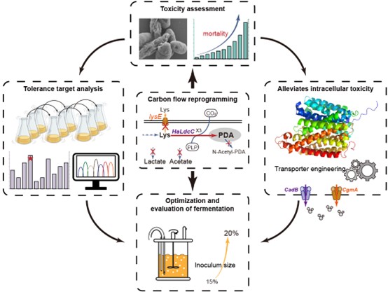 1,5-戊二胺(PDA)是合成生物基聚酰胺的关键单体,传统化学合成往往伴随着高污染与高耗能,同时环境不友好与不可持续的特性限制了其大规模生产;随着合成生物技术的快速发展,发酵法生产PDA正在逐渐取代传统的化学合成,但同时微生物合成又受限于高浓度PDA造成的严重细胞毒性。