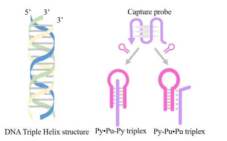 周楠迪教授团队利用非常规核酸结构三螺旋DNA具有的高度灵活性以及包含更多核酸链这一特性,通过结合链置换扩增技术,构建了基于三螺旋分子开关的金黄色葡萄球菌生物传感器。首先,利用磁珠分离体系,对溶液中的金黄色葡萄球菌进行识别。磁珠表面修饰部分互补双链Apt-cDNA,靶标与适配体结合后,置换下的cDNA通过磁性分离技术收集。随后在引物,聚合酶和切刻酶的作用下,触发链置换扩增反应,实现目标单链DNA的扩增。与此同时,在电极表面修饰事先合成的三螺旋DNA分子开关,由于三螺旋DNA结构的稳定存在,溶液中显示低电流信号。将链置换扩增产物加入电极反应体系,扩增单链DNA与三螺旋DNA的帽子区域互补,打开分子开关。电极表面剩余的富G序列形成G-四链体结构,与氯化血红素结合形成电活性复合物,产生显著的电化学信号。该生物传感器可检测30-3×108 CFU/mL动态范围内的金黄色葡萄球菌,检测限低至8 CFU/mL。同时,通过更换识别适配体和引物,该传感器可应用与其他微生物的检测,具有一定的通用性。本研究为食品和环境中多种有害微生物的检测提供了一种替代方法,具有良好的应用前景。